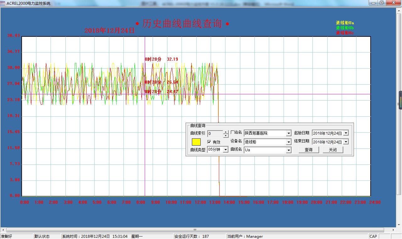 在曲線查詢界面,可以直接查看各電參量曲線,包括溫度、濕度、水位、氣體(SF6、O2、O3)、三相電流、三相電壓、有功功率、無功功率、功率因數等曲線。