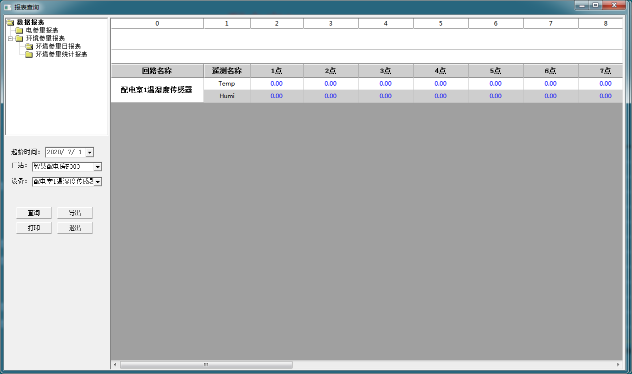 查詢各回路或設備指定時間的運行參數,報表中顯示設備信息應包括配電室溫度、濕度、有害氣體等參數信息.