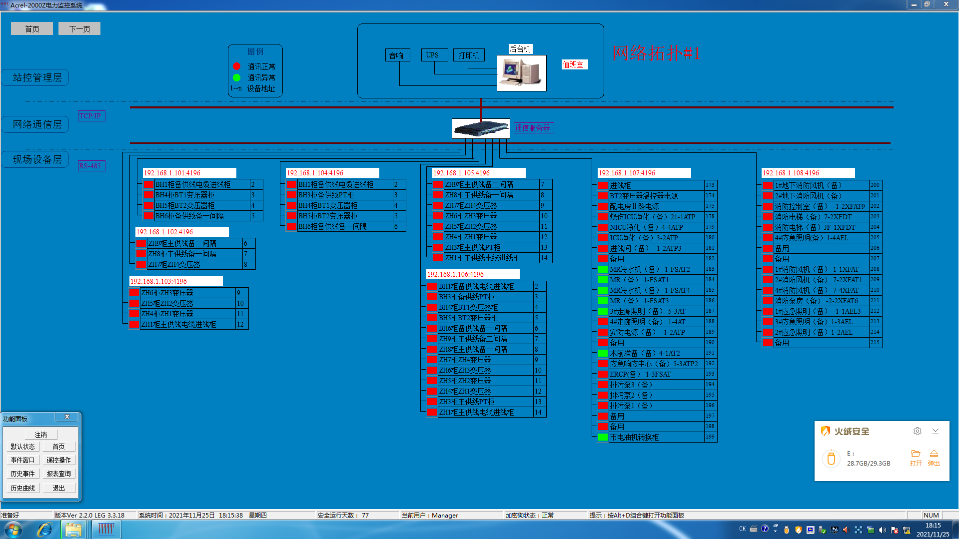 系統(tǒng)通訊結(jié)構(gòu)示意圖,主要顯示系統(tǒng)的組網(wǎng)結(jié)構(gòu),系統(tǒng)采用分層分布式結(jié)構(gòu),同時(shí)監(jiān)測間隔層設(shè)備的通信狀態(tài)。紅色表示通訊正常,綠色表示通訊故障。見圖(5)。