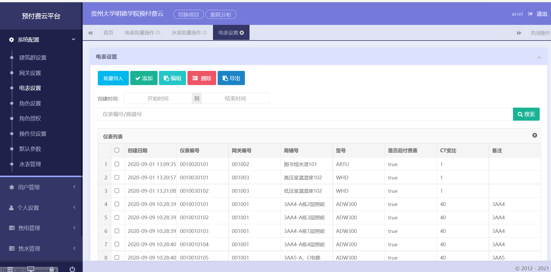 隨著社會生產的進步,在商業辦公樓用電量不斷增長、對供電質量要求不斷提高的同時,也存在大量拖欠電費的情況,極大的加重了商業辦公樓的經營風險。為了使商業辦公樓提高電費收繳率,規避惡意欠費造成的經濟損失,我公司特提供遠程預付費解決方案,系統不但可以預收電費,實現“先交錢、后用電”,又可針對用戶有選擇性的進行限電?,F場通過遠程預付費的系統,實現了先交費后用電,可以避免貴州明德學院節能項目物業電費墊資問題,從而緩解了物業運營的資金壓力,防止了私接偷電的問題。