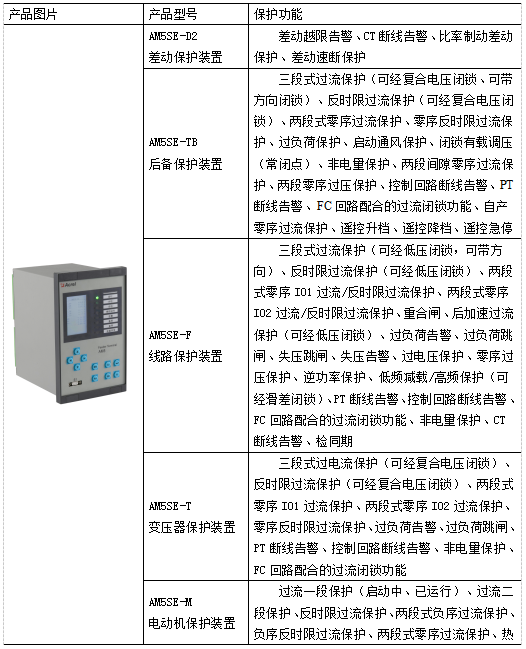 本次針對(duì)該35kV配電工程項(xiàng)目中不同保護(hù)對(duì)象配置不同微機(jī)保護(hù)裝置,35kV主變柜按主保護(hù)加后備保護(hù)配置:差動(dòng)保護(hù)裝置AM5SE-D2、高后備保護(hù)裝置AM5SE-TB;35kV進(jìn)線柜配置AM5SE-F線路保護(hù)裝置;35kV分段柜配置AM5SE-B備自投保護(hù)裝置;35kV母線設(shè)備柜配置AM5SE-UB PT并列及監(jiān)測(cè)裝置;10kV開(kāi)閉所進(jìn)線柜配置AM5SE-TB低后備保護(hù)裝置;裝置變電所和循環(huán)水場(chǎng)變電所10kV進(jìn)線柜配置AM5SE-F線路保護(hù)裝置;10kV備用出線柜配置AM5SE-F線路保護(hù)裝置;10kV電容補(bǔ)償柜配置AM5SE-C電容器保護(hù)裝置;10kV電動(dòng)機(jī)出線柜配置AM5SE-M電動(dòng)機(jī)保護(hù)裝置,10kV變壓器出線柜配置AM5SE-T變壓器保護(hù)裝置;10kV分段柜配置AM5SE-B備自投保護(hù)裝置;10kV母線設(shè)備柜配置AM5SE-UB PT并列及監(jiān)測(cè)裝置。其中,根據(jù)本次項(xiàng)目需求,在AM5SE-TB低后備保護(hù)裝置上增加遙控升檔,遙控降檔,遙控急停,來(lái)實(shí)現(xiàn)主變壓器的檔位調(diào)節(jié),并采集變壓器的檔位信號(hào),上傳至電力監(jiān)控系統(tǒng);在35kV側(cè)進(jìn)線柜和分段柜對(duì)應(yīng)的保護(hù)裝置增加檢同期功能,確保在停電檢修時(shí),為不影響正常生產(chǎn),能夠可靠合環(huán)。針對(duì)各高壓開(kāi)關(guān)柜配置智能操控?zé)o線測(cè)溫一體化裝置ASD320,每面開(kāi)關(guān)柜配置6點(diǎn)測(cè)溫,其中,PT柜配置電池型無(wú)線測(cè)溫傳感器ATE200,其余高壓開(kāi)關(guān)柜配置CT取電型無(wú)線測(cè)溫傳感器ATE400。各型號(hào)產(chǎn)品主要實(shí)現(xiàn)的功能如下:
