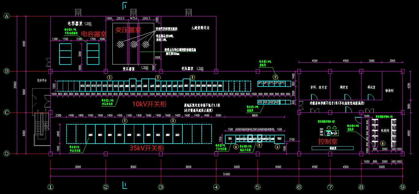 本工程為山東凱瑞英材料科技有限公司35kV供配電工程,共有35kV總變電所一個(gè),包括35kV配電系統(tǒng)和總變10kV配電系統(tǒng); 10kV循環(huán)水場(chǎng)變電所一個(gè);10kV裝置變電所一個(gè)。本工程由兩路35kV電源供電,安裝兩臺(tái)容量為16MVA的主變壓器。35kV總變電所配置8面KYN61-40.5中置式開(kāi)關(guān)柜,進(jìn)出線方式為電纜下進(jìn)下出,柜體顏色為RAL7035,斷路器選用VBG-40.5P-31.5,電流互感器選用LZZBJ9-35D1;配置25面KYN28A-12(Z)中置式開(kāi)關(guān)柜,進(jìn)出線方式為銅排上進(jìn),電纜下出,柜體顏色為RAL7035,斷路器選用VBG-E-12P-31.5,電流互感器選用LZZBJ9-10C1。循環(huán)水場(chǎng)變電所配置25面KYN28A-12(Z)中置式開(kāi)關(guān)柜,進(jìn)出線方式為電纜下進(jìn),電纜下出,柜體顏色為RAL7035,斷路器選用CZK2-12-31.5,電流互感器選用LZZBJ9-10C1。裝置變電所配置24面KYN28A-12(Z)中置式開(kāi)關(guān)柜,進(jìn)出線方式為電纜下進(jìn),電纜下出,柜體顏色為RAL7035,斷路器選用CZK2-12-31.5,電流互感器選用LZZBJ9-10C1。本工程共有一個(gè)35kV變電站和1個(gè)10kV開(kāi)閉所,2個(gè)10kV變電所,35kV市電引入后經(jīng)由35kV/10kV變壓器,降至10kV電引入開(kāi)閉所,再由開(kāi)閉所進(jìn)行分配電能至各個(gè)分變電所,整個(gè)變電站的一次系統(tǒng)干線圖以及平面布局圖如下: