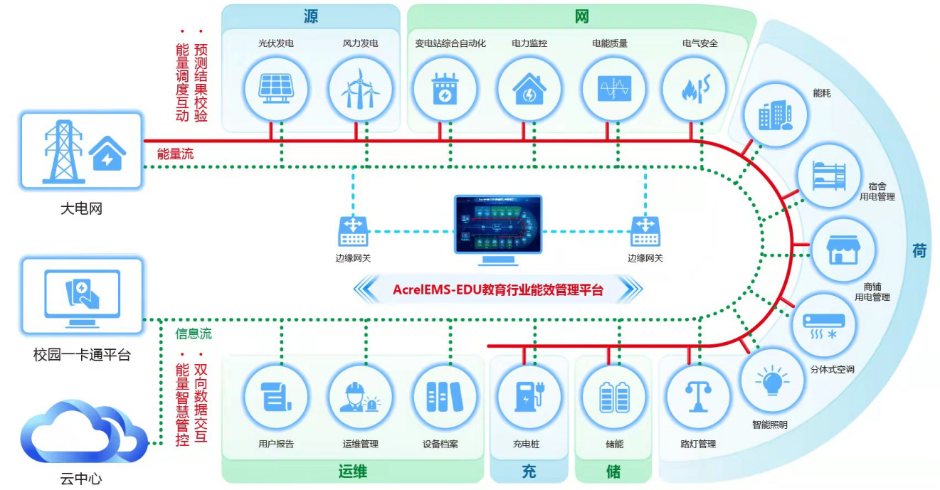 AcrelEMS-EDU校園綜合能效管理解決方案針對校園能源統計、后勤計費管理、校園運維管理等提供高校的信息化管理平臺。從“源、網、荷、儲、充”多個角度解析高校當下及未來的用能問題及用能需求,在統一的需求下“實現能源互補、信息互通”等管理模式。助力學校管理智能化、數字化、綜合化,實現節能校園、綠色校園、低碳校園。
