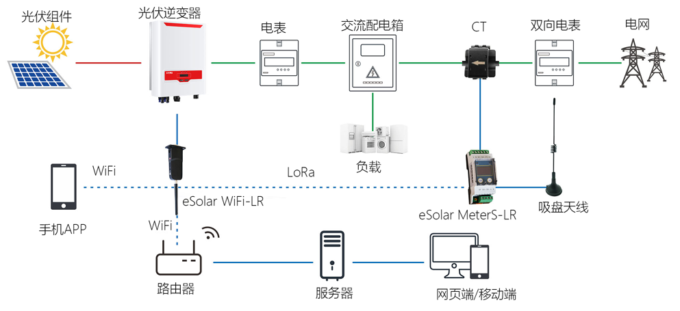 防逆流監測裝置原理:在并網點安裝防逆流電表或者電流傳感器,當檢測到有電流流向電網時,通過485通訊給逆變器一個信號,逆變器降低輸出功率,直至反向輸出電流為零,從而實現防逆流功能。根據系統電壓等級不同,光伏系統可分為單相防逆流系統和三相防逆流系統。