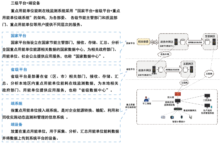 重點(diǎn)用能單位能耗在線監(jiān)測系統(tǒng)采用“國家平臺+省級平臺+重點(diǎn)用能單位端系統(tǒng)”的架構(gòu),為各部委、 各級節(jié)能主管部門和質(zhì)監(jiān)部門、重點(diǎn)用能單位等用戶提供不同層次的服務(wù)。
