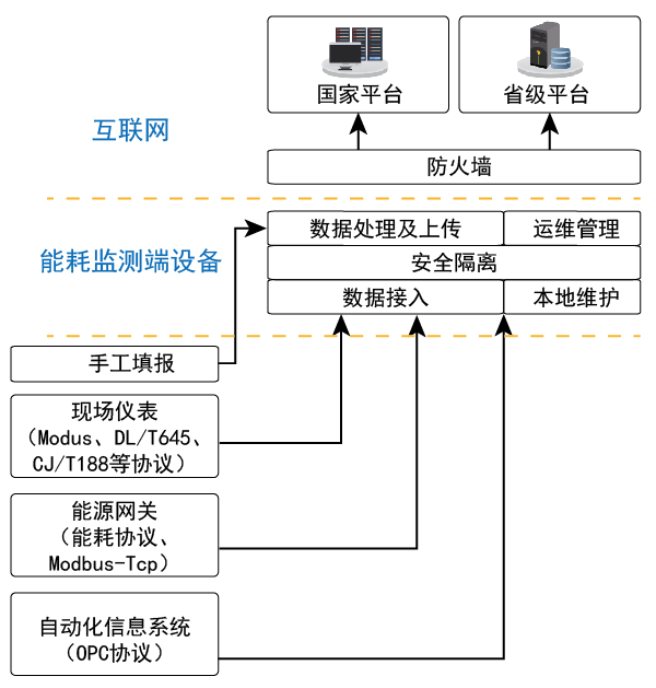主要功能:通過計(jì)量儀表、工控系統(tǒng)等采集、匯總本單位能耗數(shù)據(jù),將數(shù)據(jù)上傳至省級平臺,或直接上傳至國家平臺;重點(diǎn)用能單位接入端系統(tǒng)要通過網(wǎng)閘、防火墻、隔離等安全措施,確保內(nèi)部系統(tǒng)安全和數(shù)據(jù)安全;要具備遠(yuǎn)程升級維保、一端多傳、接收國家和省級平臺推送信息和用能單位自身能源管理所需的功能。
