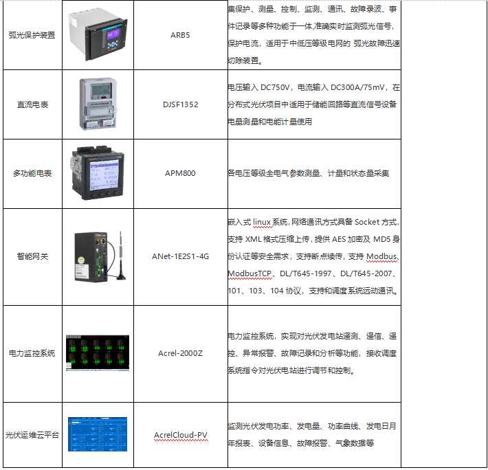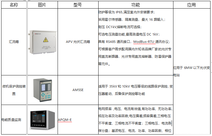 上圖為一個1MW分布式光伏電站的示意圖,光伏陣列接入光伏匯流箱,經過直流柜匯流后接入集中式逆變器(直流柜根據情況可不設置),最后經過升壓變壓器升壓至10kV或35kV后并入中壓電網。由于光伏電站裝機容量比較大,涉及到的保護和測控設備比較多,主要如下表: