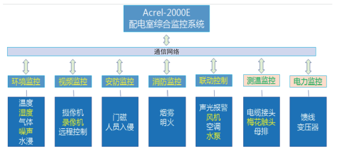 Acrel-2000E配電室綜合監控系統,可實現開關柜運行監控、高壓開關柜帶電顯示、電流電壓等負載運行監測、母線及電纜測溫監測、環境溫濕度監測、有害氣體監測、安防監控,可對燈光、風機、除濕機、空調控制等設備進行聯動控制。實現動力環境各數據的檢測與設備控制,優化動力環境,避免運行環境的失控導致配電設備運行故障,保證維護人員安全,延長設備使用壽命,實現配電動力環境的分布式遠程管理。