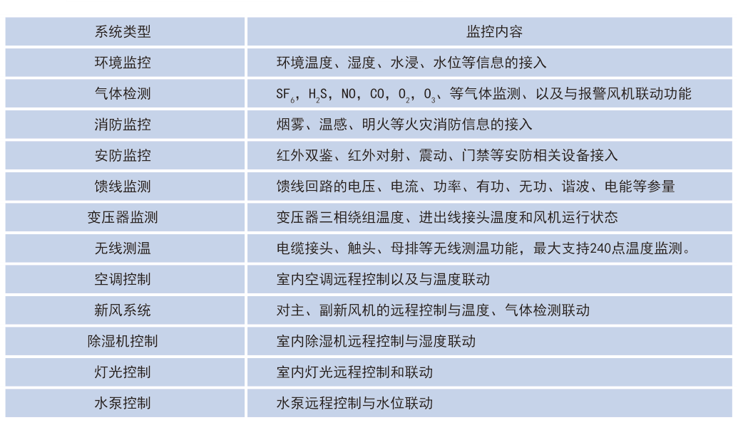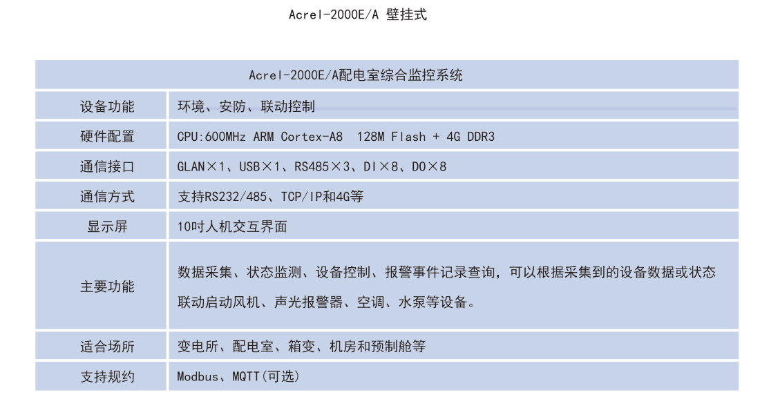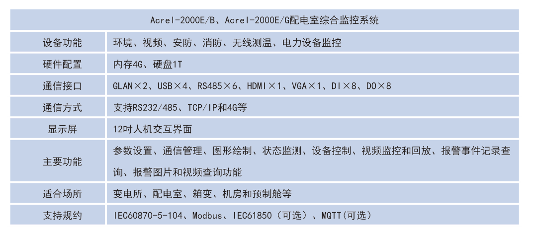 由于硬件資源以及系統軟件上的差別,Acrel-2000E/A作為針對變電所配電室的環境輔助監控系統,只對環境參量設備進行在線監測;而Acrel-2000E/B與Acrel-2000E/G作為硬件資源豐富,系統功能更為強大的設備,可以配合我司無線測溫以及電力儀表進行在線監測。