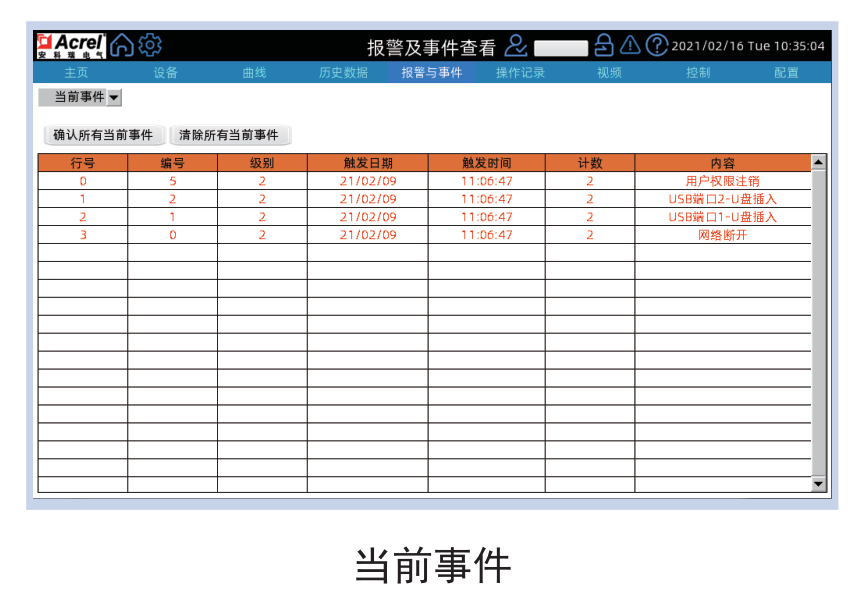 在“當前事件”的界面,有事件類型下拉框、事件列表、確認全部當前事件以及清除全部當前事件按鈕共4個部分,點擊確認按鈕可以確定列表中所有還未確認的事件,點擊清除按鈕可以清除列表中所有事件。